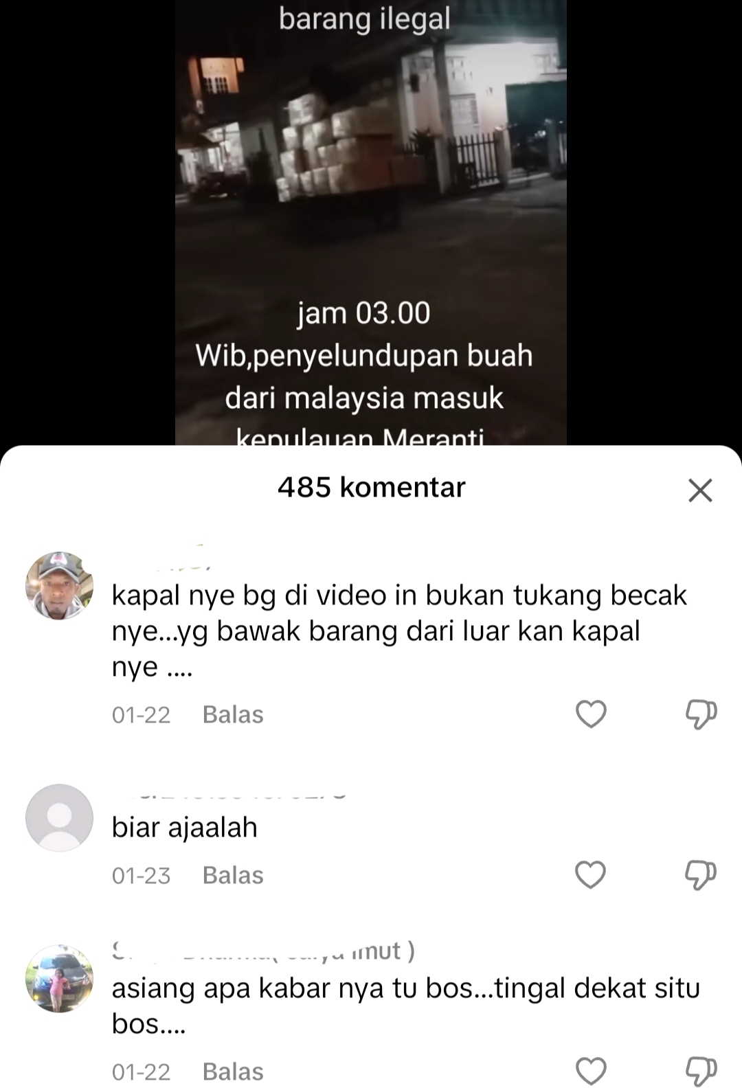 Meranti|| Sebelumnya sempat viral psotingan di media sosial TikTok dengan akun @Impal (Kopiisusuuuhh) pada Rabu 22 Januari 2025 lalu, peristiwa sekitar pukul 03.00 dini hari itu di duga sedang melakukan pengangkutan ratusan Kotak Buah Impor Ilegal dari negara tetangga Malaysia yang Masuk ke Selat Panjang Kota di Jl. Penggaram kabupaten kepulauan Meranti Provinsi Riau.