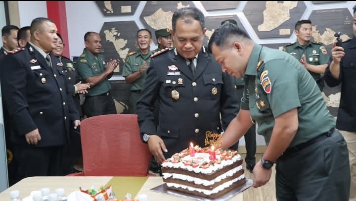 Acara dilanjutkan dengan pemotongan kue, doa bersama, serta pemberian potongan kue kepada perwira termuda, Letda Cku Arih Siswanto, S.M. Suasana hangat ini diakhiri dengan sesi foto bersama sebagai simbol kekompakan dua institusi penjaga keamanan negara.