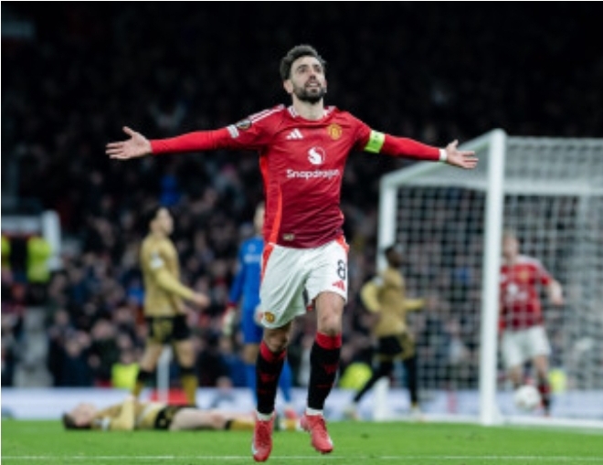 Manchester United menamatkan Real Sociedad. Bruno Fernandes mencetak gol ketiganya di menit ke-87, untuk memperbesar keunggulan MU 3-1 (agregat 4-2).