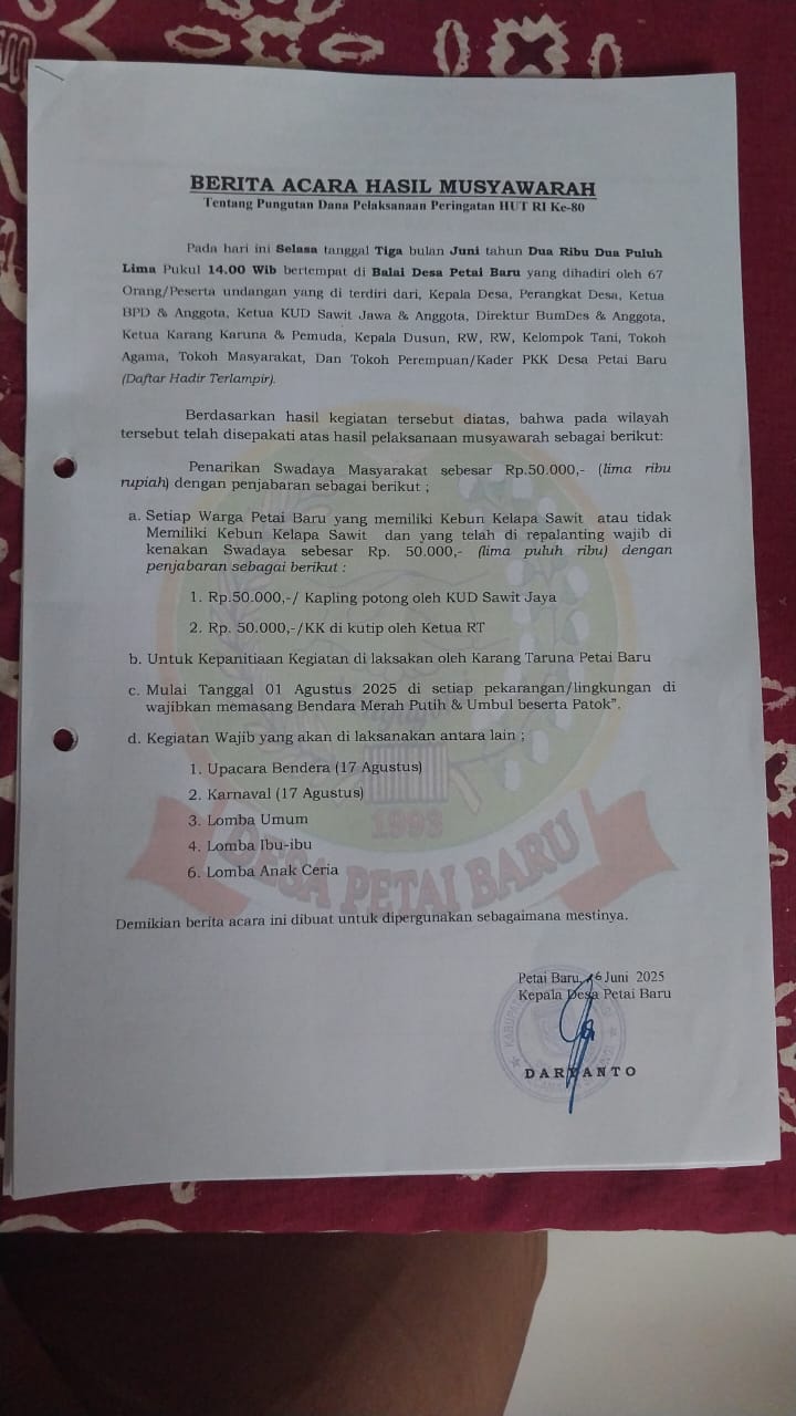 Menurut Kepala Desa Petai Baru, Bahwasanya kesepakatan iuran untuk menyambut HUT RI ke 80 mendatang sudah melalui prosedur dengan melakukan Musyawarah di Desa.