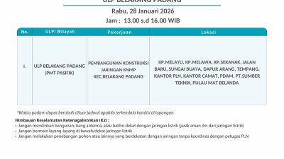 Batam | PT PLN (Persero) melalui Unit Layanan Pelanggan (ULP) Belakang Padang kembali menjadwalkan pemeliharaan jaringan listrik sebagai bagian dari upaya peningkatan keandalan pasokan energi bagi masyarakat. Kegiatan tersebut akan dilaksanakan pada Kamis, 29 Januari 2026.