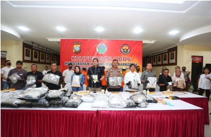 Dalam penjelasannya Dirresnarkoba Polda Kepri AKBP Anggoro Wicaksono, S.H., S.I.K., M.H., menjelaskan “Barang bukti yang berhasil disita dari 4 Laporan Polisi tersebut yaitu Narkotika jenis Sabu sebanyak 999,96 (Sembilan Ratus Sembilan Puluh Sembilan koma Sembilan Enam) gram, disisihkan untuk pembuktian di pengadilan sebanyak 2 gram, disisihkan untuk pemeriksaan labfor sebanyak 0,13 gram, dan disisihkan untuk dimusnahkan sebanyak 997,86 gram. Narkotika Jenis Ganja Kering sebanyak 2.673,52 (Dua Ribu Enam Ratus Tujuh Puluh Tiga Koma Lima Dua) Gram, disisihkan untuk pembuktian di pengadilan sebanyak 4 gram, disisihkan untuk pemeriksaan labfor sebanyak 0,69 gram, dan disisihkan untuk dimusnahkan sebanyak 2.668,83 (Dua Ribu Enam Ratus Enam Puluh Delapan Koma Delapan Tiga) gram. Selanjutnya Narkotika Jenis Bunga Ganja sebanyak 32.600,32 (Tiga Puluh Dua Ribu Enam Ratus Koma Tiga Dua) gram, disisihkan untuk pemeriksaan labfor sebanyak 0,82 gram, dan disisihkan untuk dimusnahkan sebanyak 32.599,5 (Tiga Puluh Dua Ribu Lima Ratus Sembilan Puluh Sembilan Koma Lima) gram.