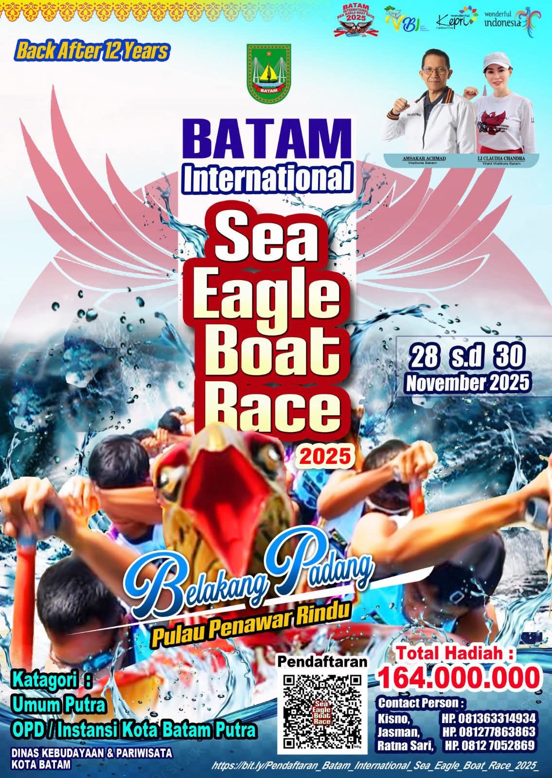 Batam | Setelah dua belas tahun vakum, Kota Batam kembali menggelar ajang bergengsi Batam International Sea Eagle Boat Race 2025. Lomba yang sarat nilai budaya dan sportivitas ini akan berlangsung pada 28 hingga 30 November 2025 di Perairan Elang-Elang, Belakangpadang.