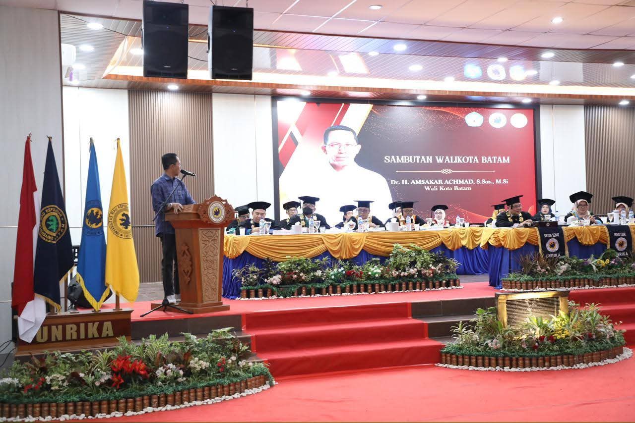 Dalam sambutannya, Amsakar menyampaikan ucapan selamat kepada seluruh wisudawan dan wisudawati yang telah menuntaskan pendidikan. Ia juga mengapresiasi kiprah Unrika yang secara konsisten mencetak SDM berkualitas dan berdaya saing untuk Batam dan Kepulauan Riau.