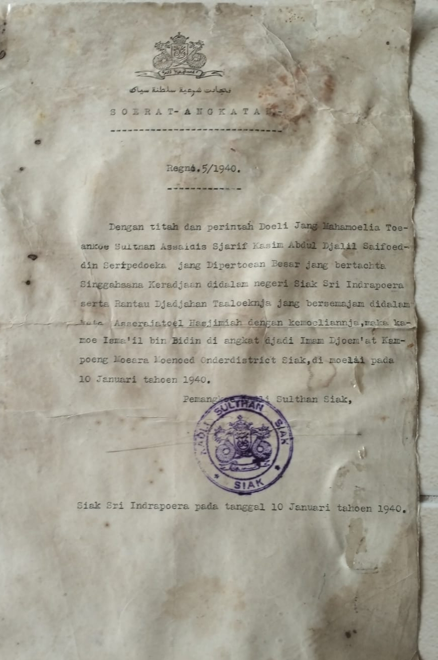 Pengangkatan tersebut ditetapkan melalui Surat Angkatan Kesultanan Siak nomor: Regno.5/1940, tertanggal 10 Januari 1940. Hal ini menunjukkan betapa besar kepercayaan Kesultanan Siak terhadap sosok Haji Imam Ismail. Ia tidak hanya menjadi imam salat, tetapi juga seorang tokoh yang dihormati dan disegani.