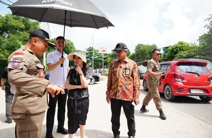 Batam | Wakil Wali Kota Batam, Li Claudia Chandra didampingi Sekretaris Daerah Kota Batam, Jefridin, M.Pd. memantau proses penertiban dan penataan reklame di depan Taman Raya Square (Taras) Kamis (26/06/2025).