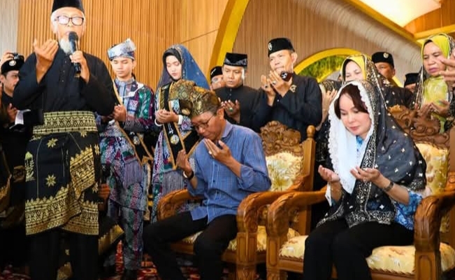 Batam | Wali Kota Batam, Amsakar Achmad, bersama Wakil Wali Kota Batam, Li Claudia Chandra, tiba di Batam, Sabtu (1/3/2025). Kedatangan Amsakar dan Li Claudia disambut dengan prosesi adat Melayu di Ruang VVIP Bandara Internasional Hang Nadim Batam.