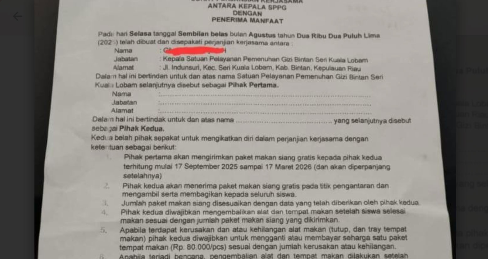 Bintan | Surat perjanjian kerja sama antara Satuan Pelayanan Pemenuhan Gizi (SPPG) dan penerima manfaat program Makan Bergizi Gratis (MBG) di Kecamatan Seri Kuala Lobam, Bintan, beredar luas di media sosial dan menuai sorotan.