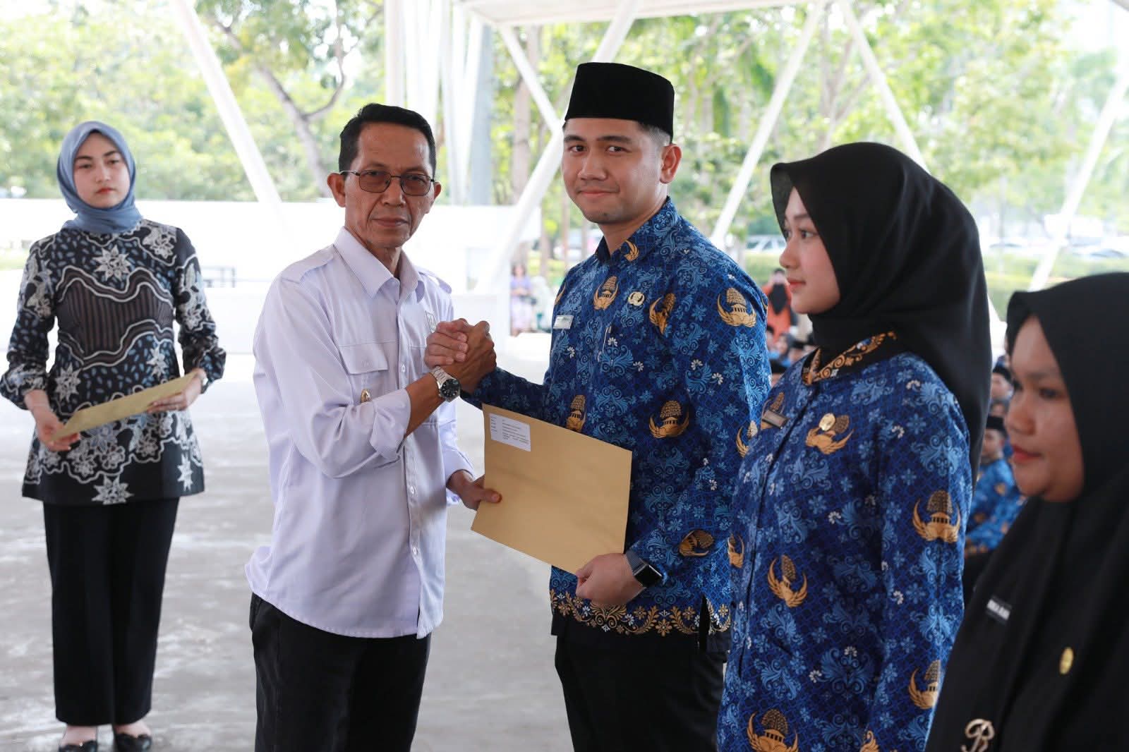 Batam | Wali Kota Batam, Amsakar Achmad, secara simbolis menyerahkan Surat Keputusan (SK) Pengangkatan Pegawai Pemerintah dengan Perjanjian Kerja (PPPK) Tahap II formasi tahun 2024 di lingkungan Pemerintah Kota Batam, di Panggung Dataran Engku Putri, Batam Centre, Jumat (26/9/2025).